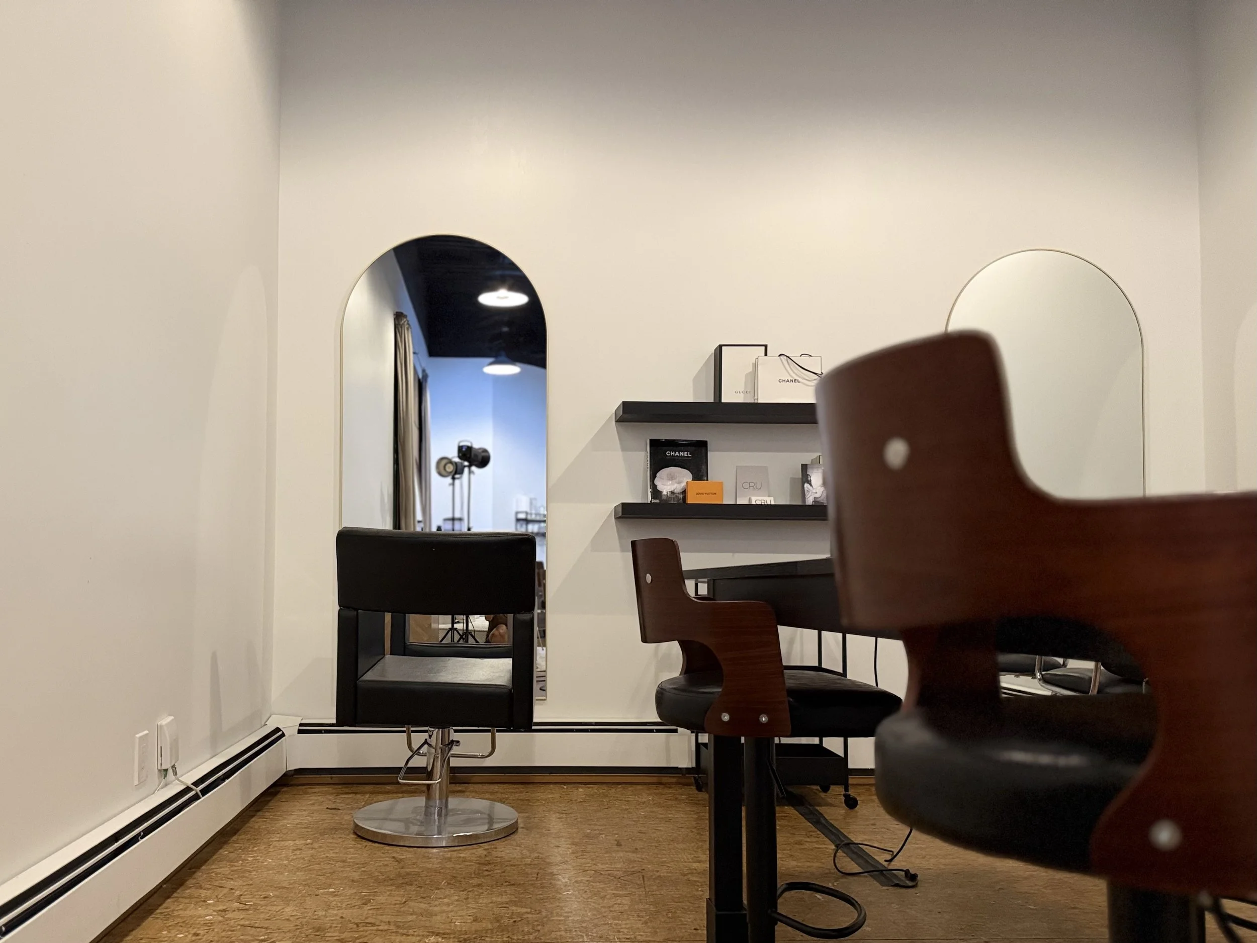 Two dedicated hair and makeup stations with full-body mirrors. A large central table provides extra space for artists and clients.