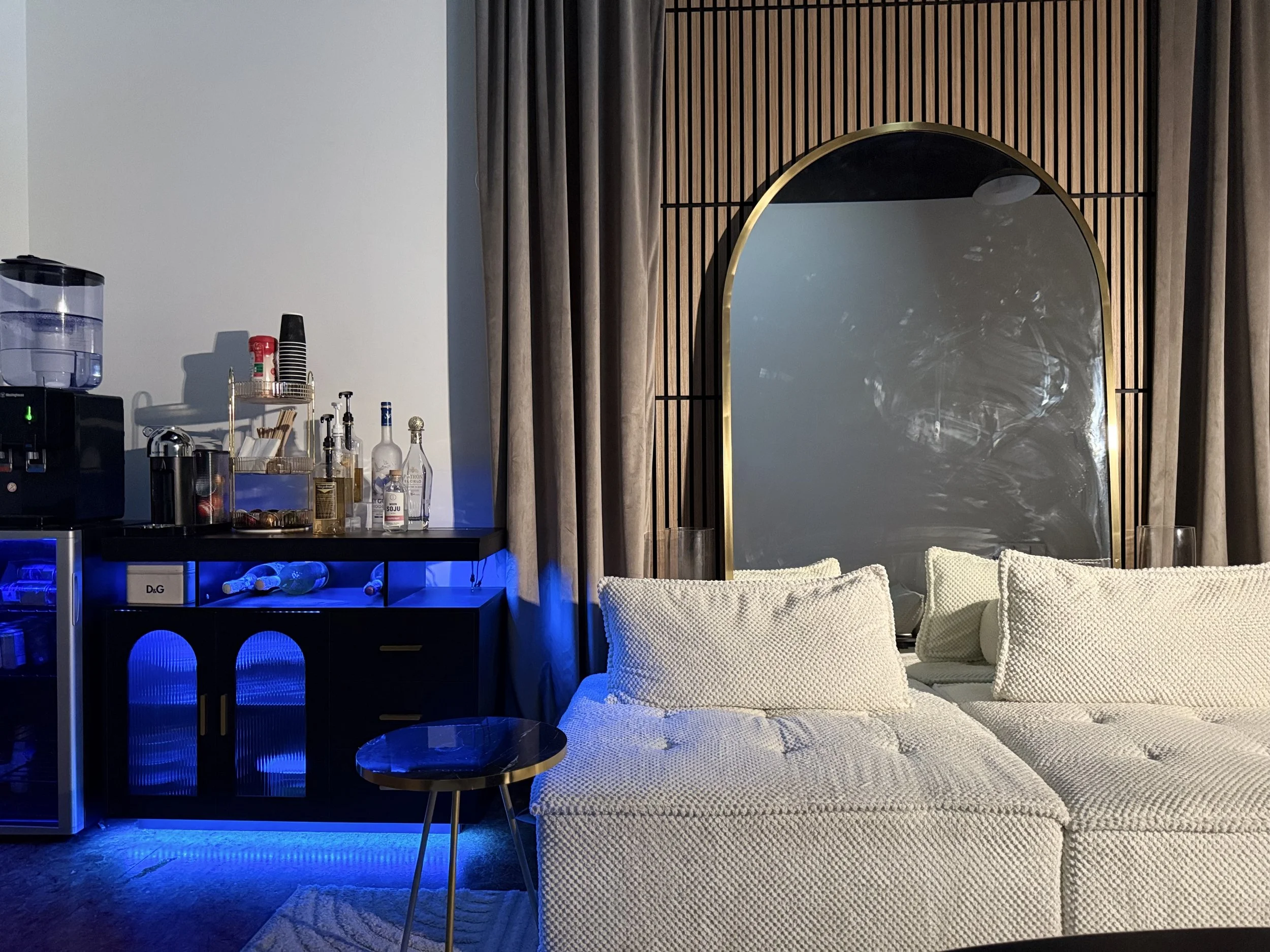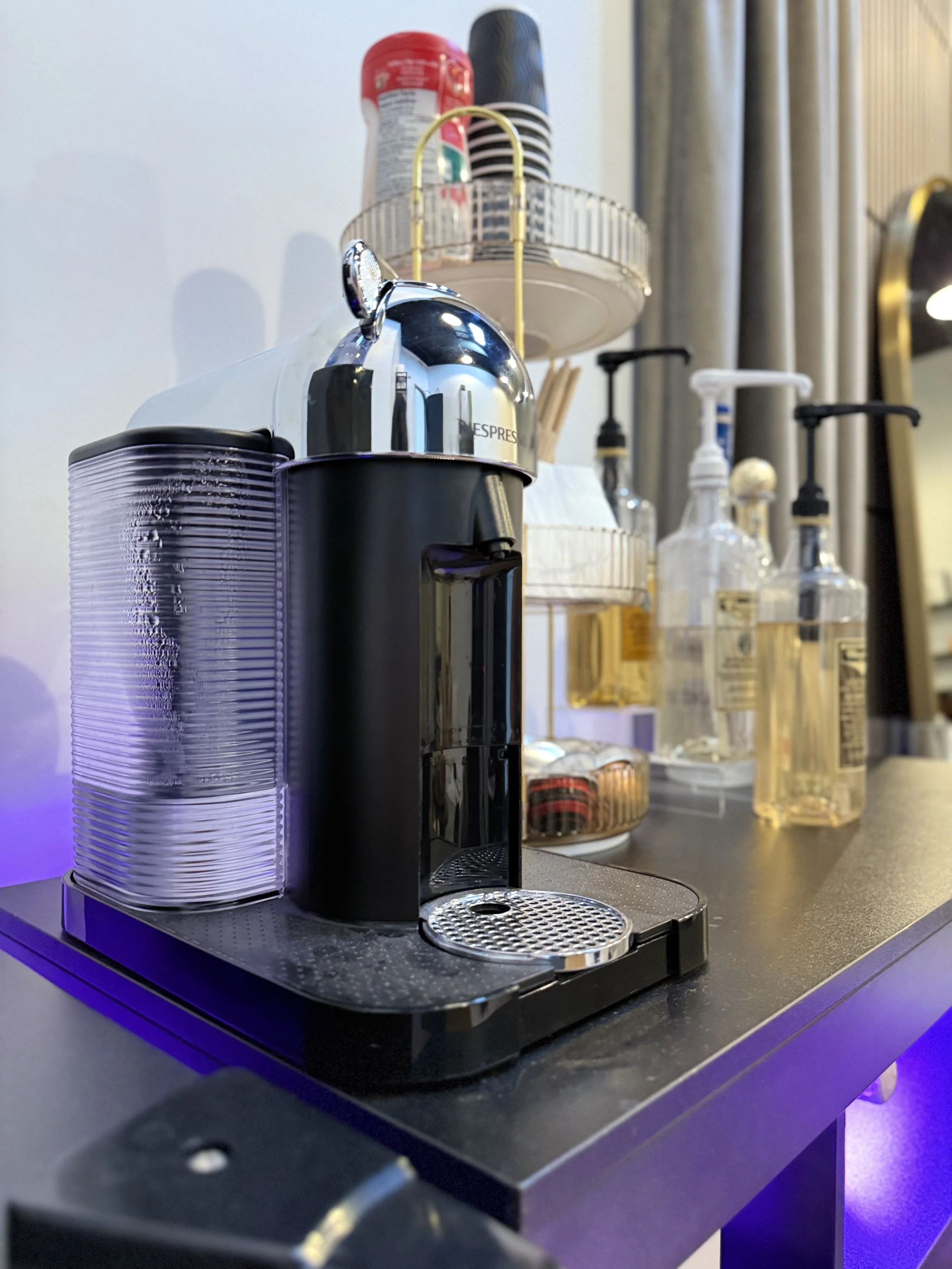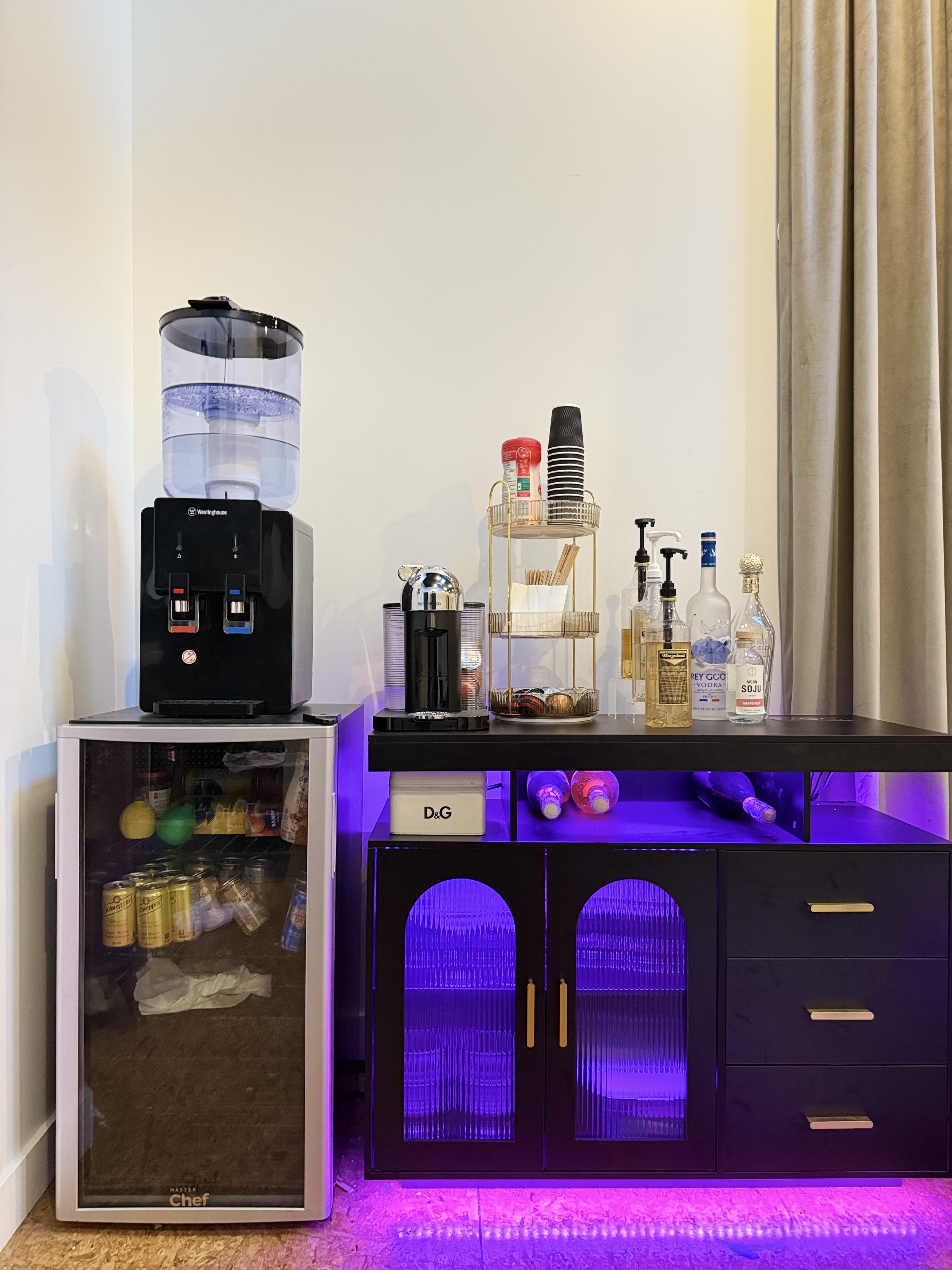 Enjoy Nespresso coffee, tea and a fridge stocked with a wide selection of beverages for your convenience. Did we mention our bar has mood lighting?
